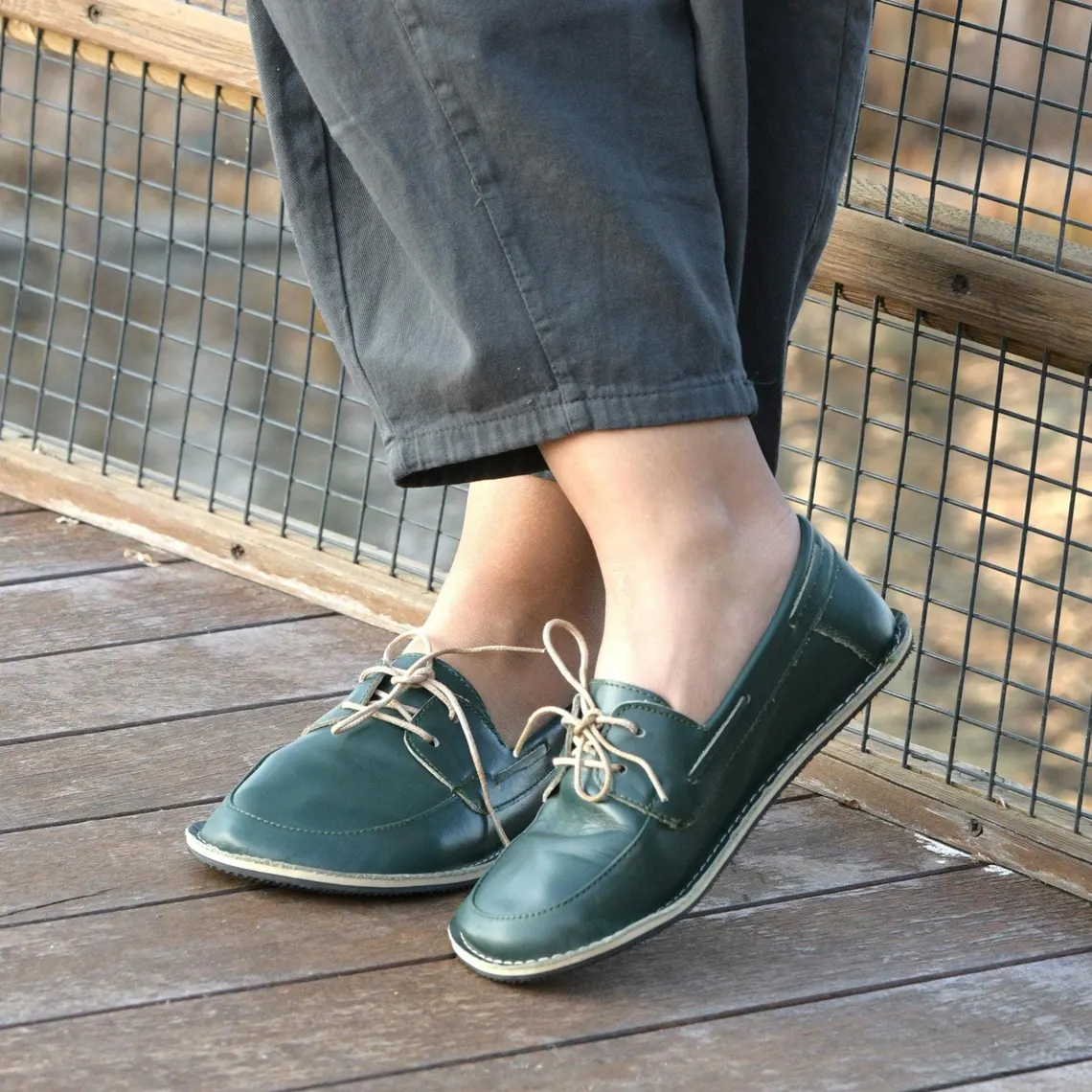 Green color barefoot boat moccasins are made of genuine leather. It has a wide toe box for your toes to be comfortable. Thanks to the zero drop rubber sole, it provides the right posture for your body.