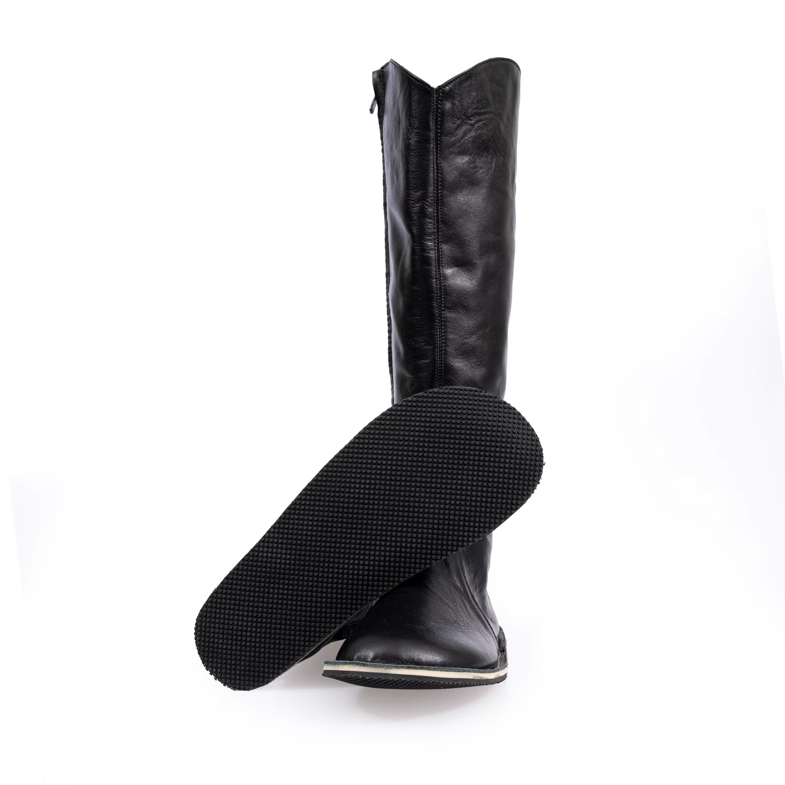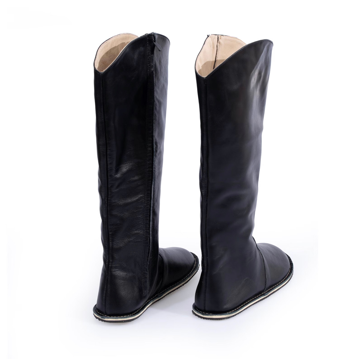 Black Genuine Leather Barefoot Knee High Boots. Crafted from high-quality leather, these boots offer a sleek look while providing the freedom your feet crave.