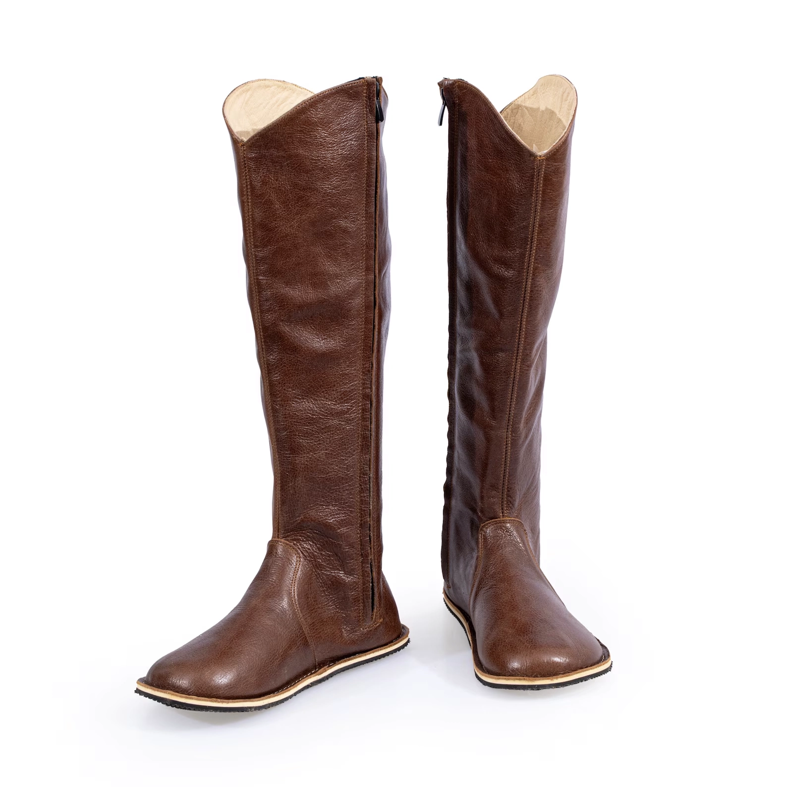 Tan Genuine Leather Barefoot Knee High Boots. Crafted from high-quality leather, these boots offer a sleek look while providing the freedom your feet crave.