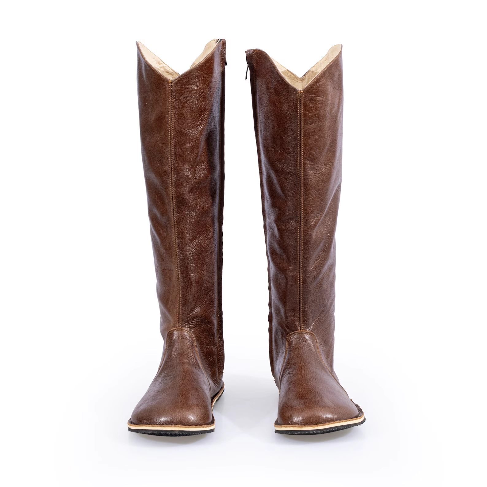 Brown Genuine Leather Barefoot Knee High Boots. Crafted from high-quality leather, these boots offer a sleek look while providing the freedom your feet crave.