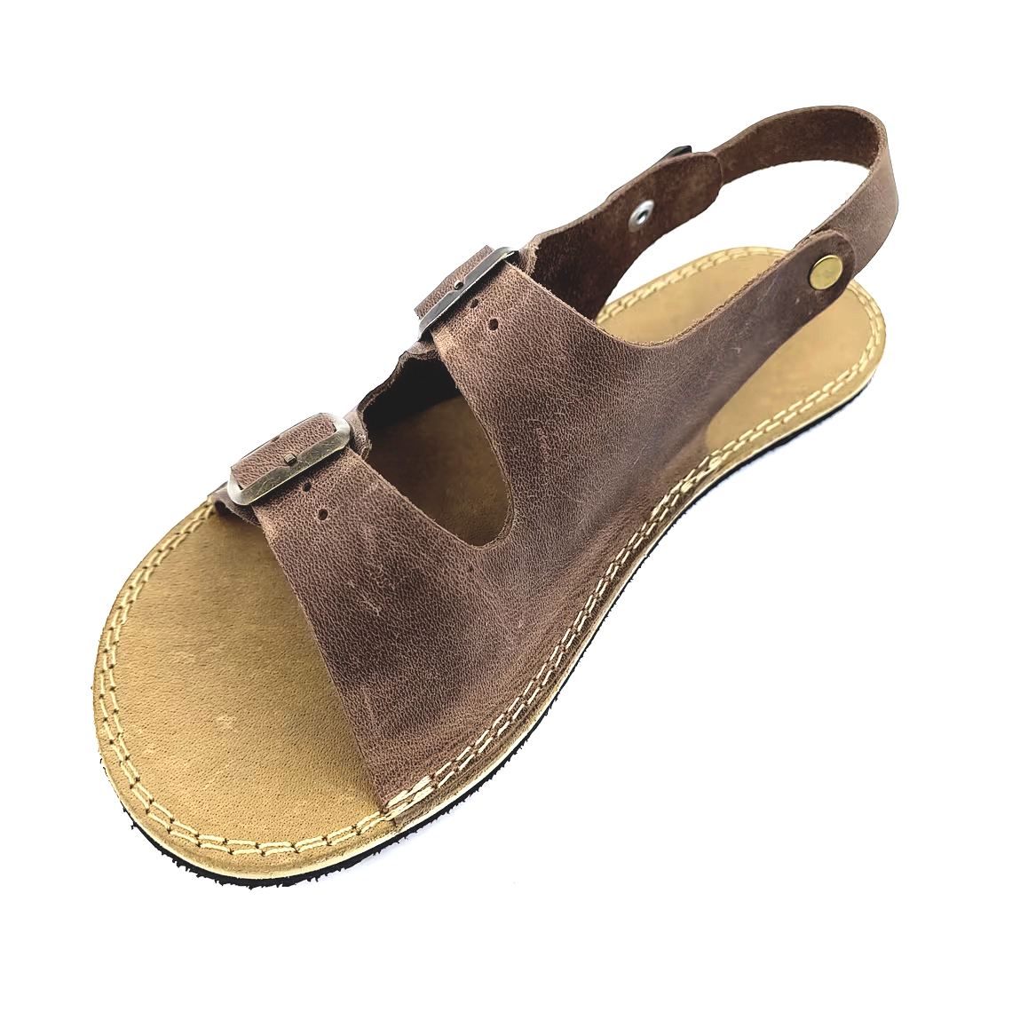 Brown color minimalist barefoot handmade soft leather open toe and closed heel woman sandals are 100% handmade from all sustainable natural materials.