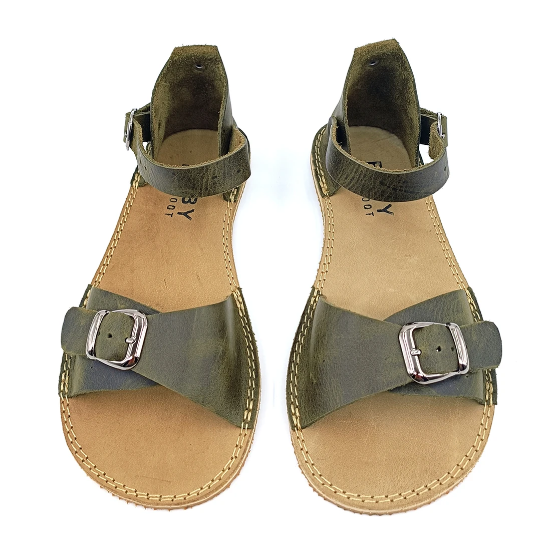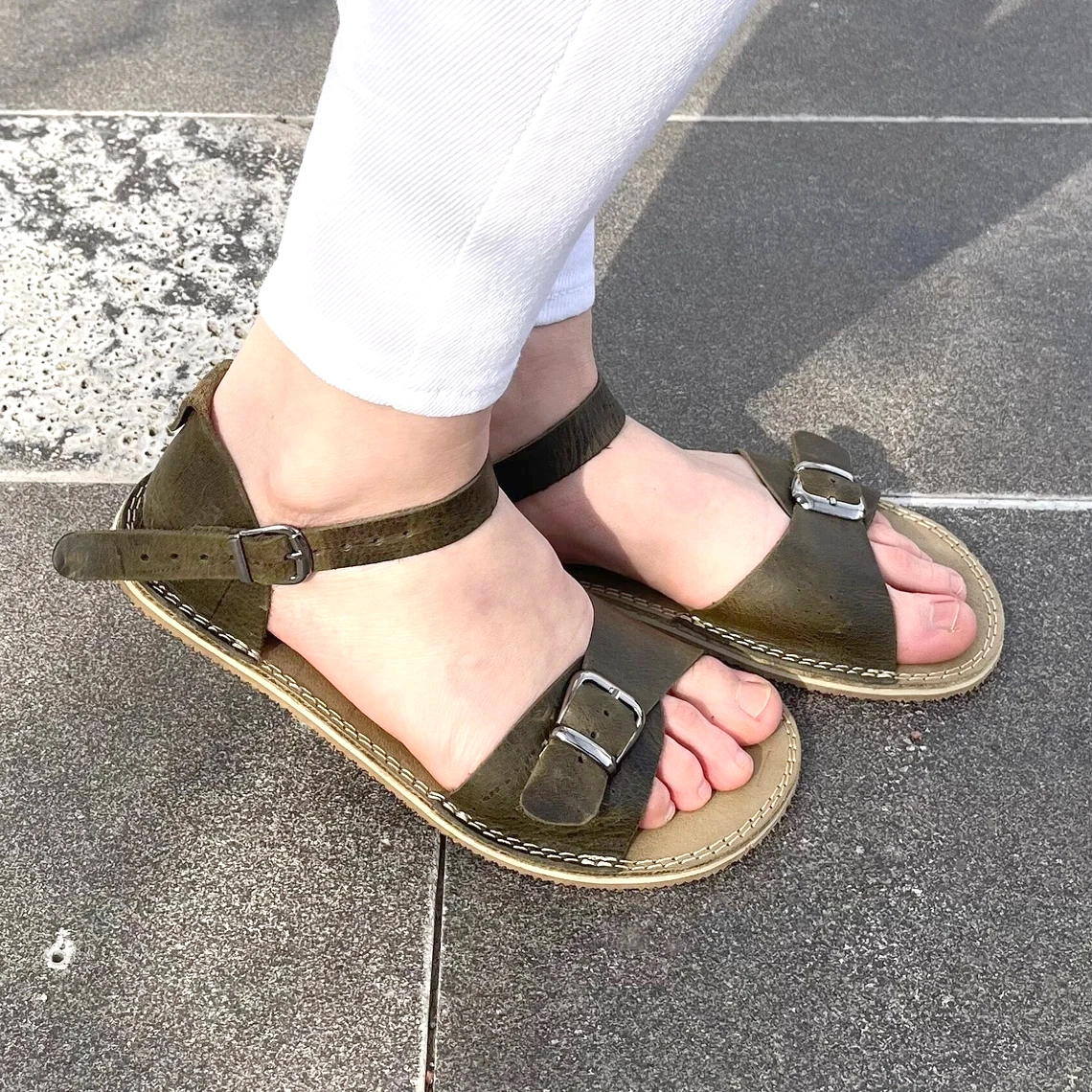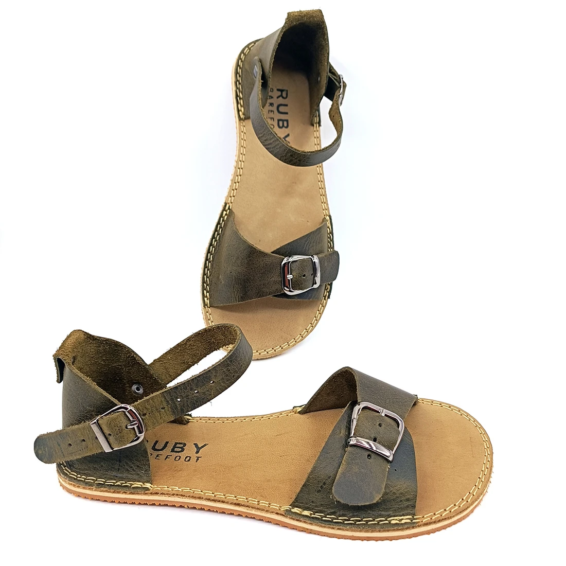 Ruby olive green color leather barefoot sandals are made of genuine leather. It has a wider toe box for your toes to be comfortable. Thanks to the zero drop rubber sole, it provides the right posture for your body. Thanks to the soft rubber sole, they are the most comfortable sandals while walking and in the holiday. Ruby barefoot sandals have narrow heels wide toe box compared to standard barefoot sandals.
