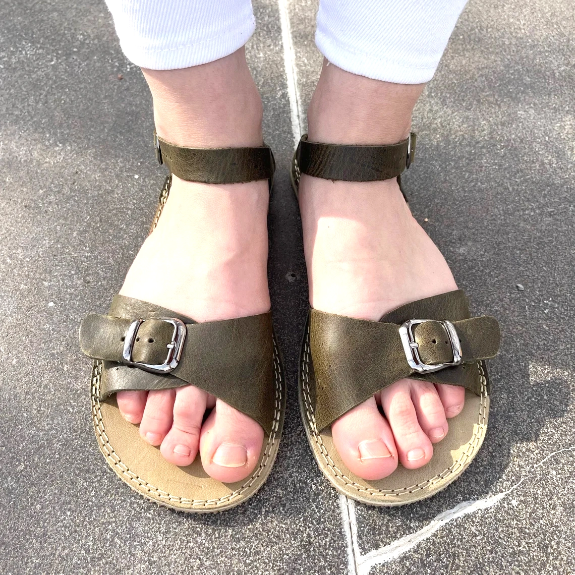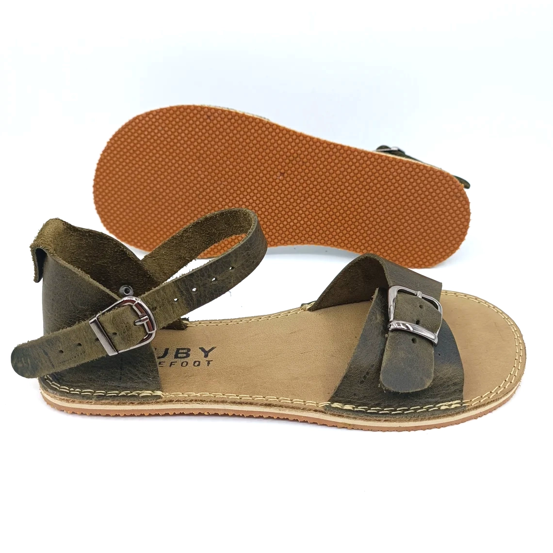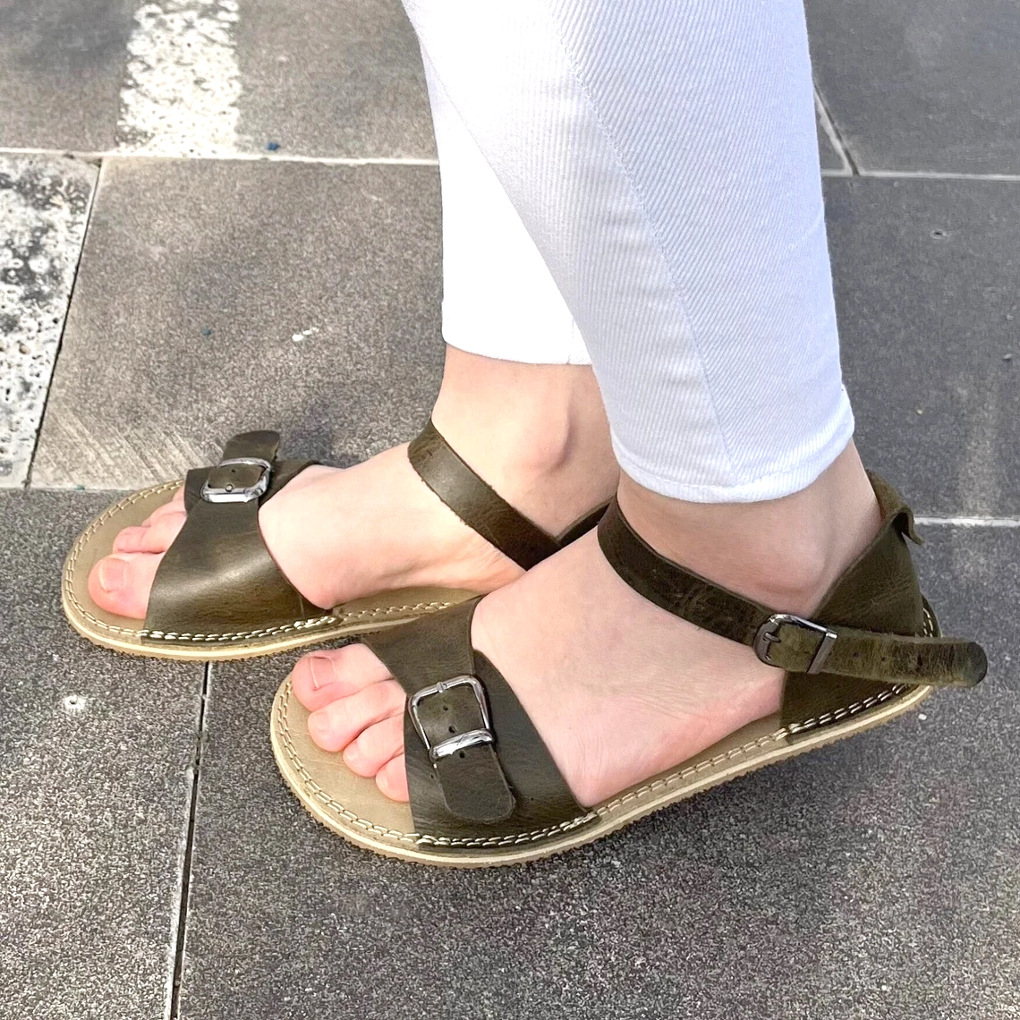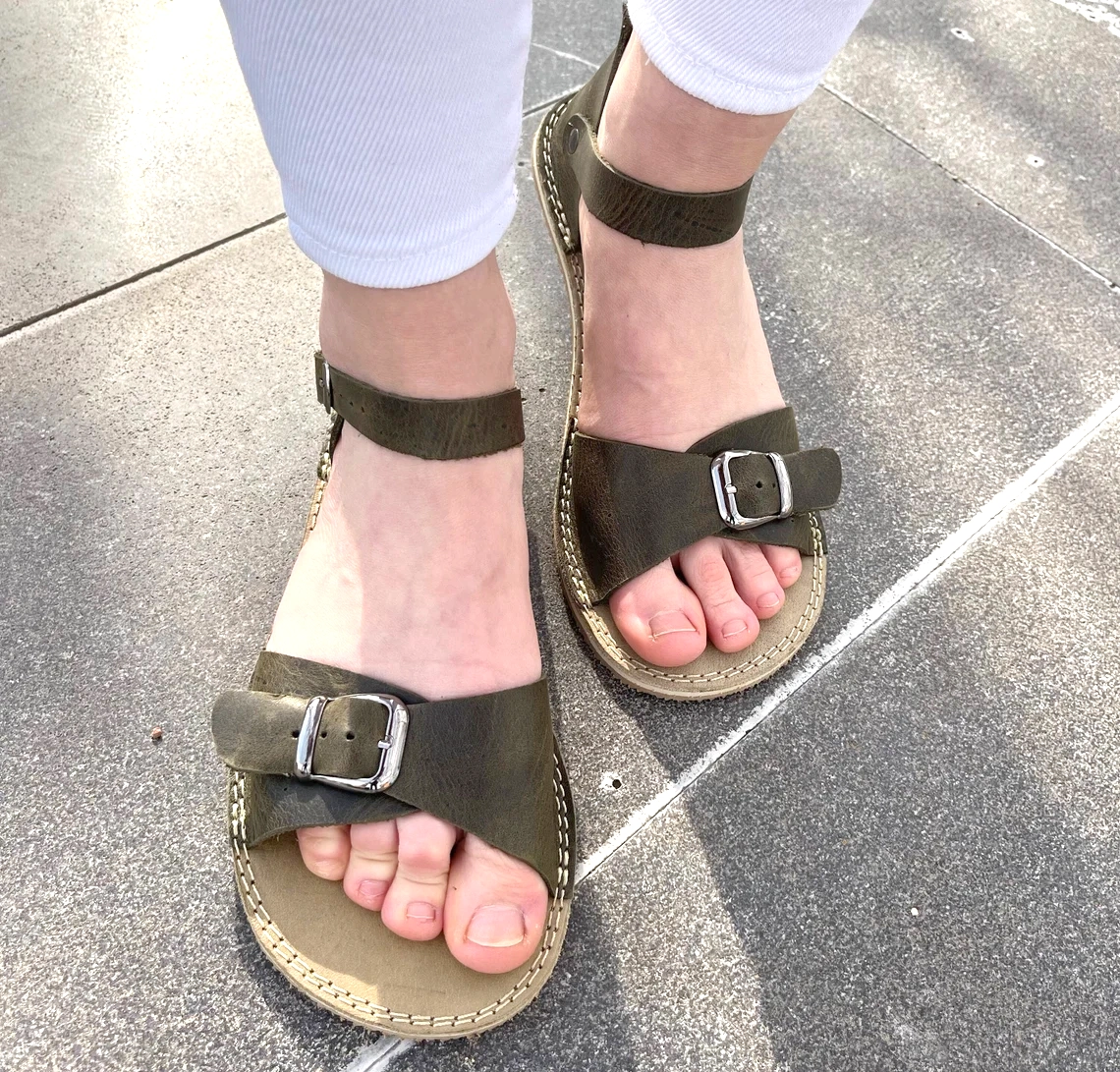 Ruby olive green color leather barefoot sandals are made of genuine leather. It has a wider toe box for your toes to be comfortable. Thanks to the zero drop rubber sole, it provides the right posture for your body. Thanks to the soft rubber sole, they are the most comfortable sandals while walking and in the holiday. Ruby barefoot sandals have narrow heels wide toe box compared to standard barefoot sandals.