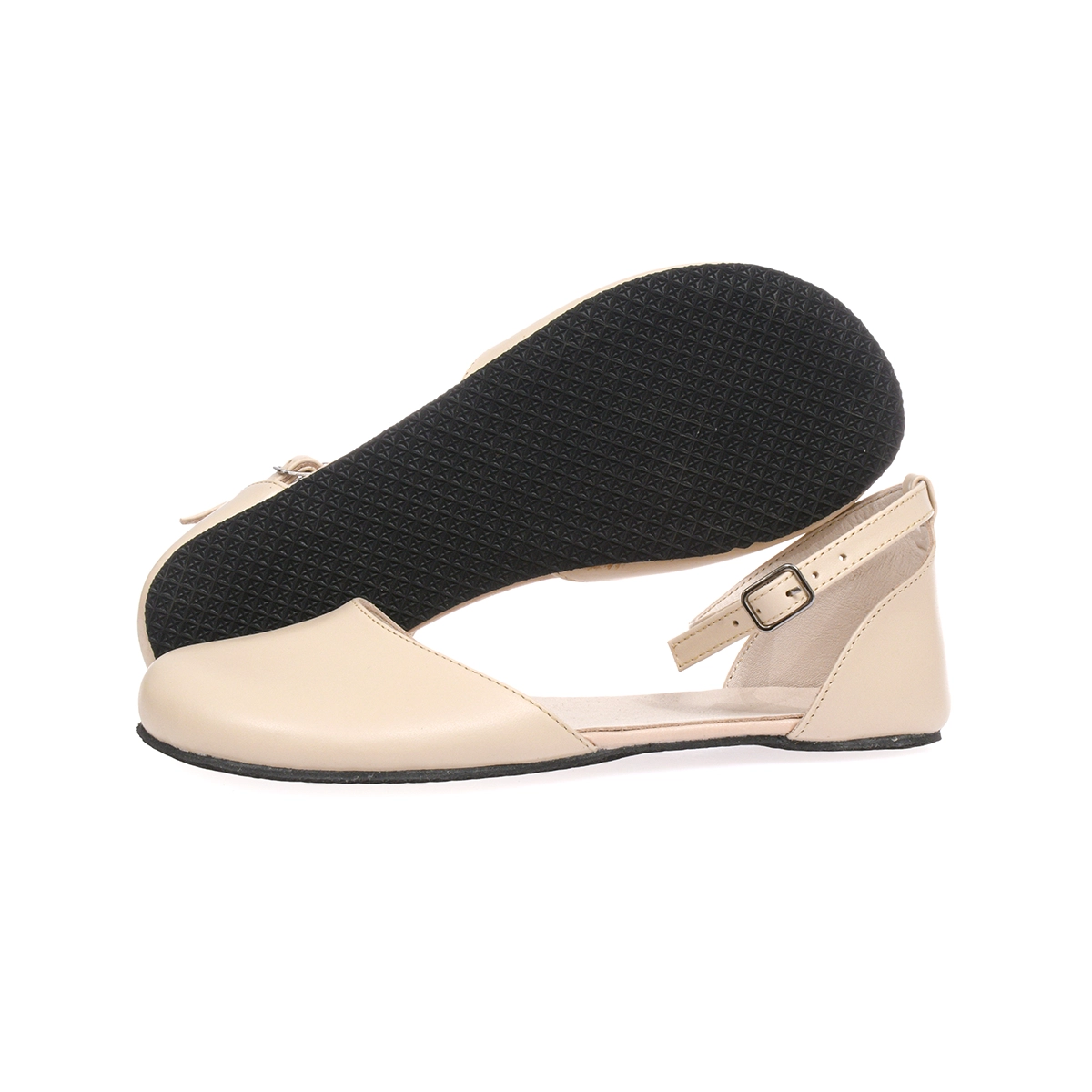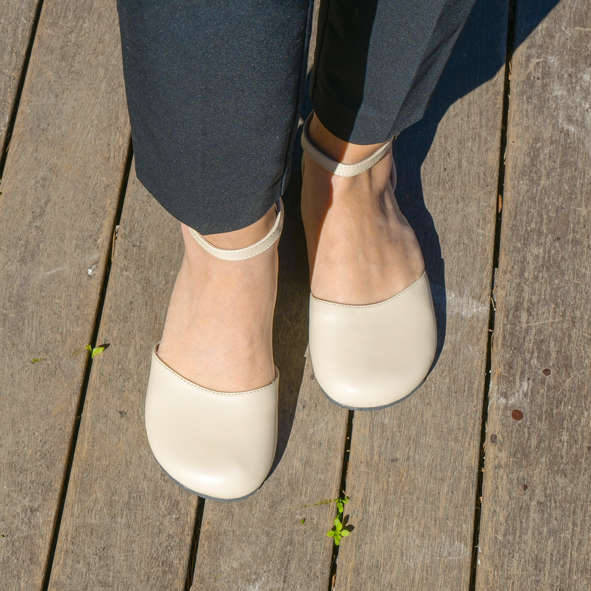 Women’s beige leather handmade barefoot Mary Jane sandals with a minimalist zero-drop sole. Lightweight, flexible, and stylish for natural comfort.