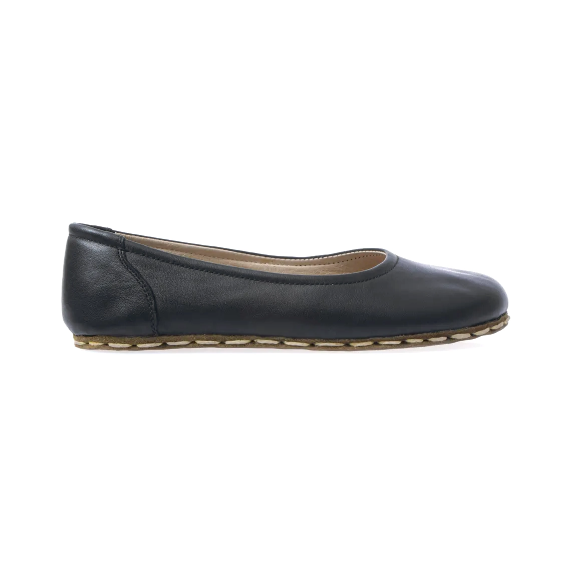 Handcrafted women’s black genuine leather barefoot ballet flats with copper earthing technology. Minimalist, flexible, and naturally comfortable.