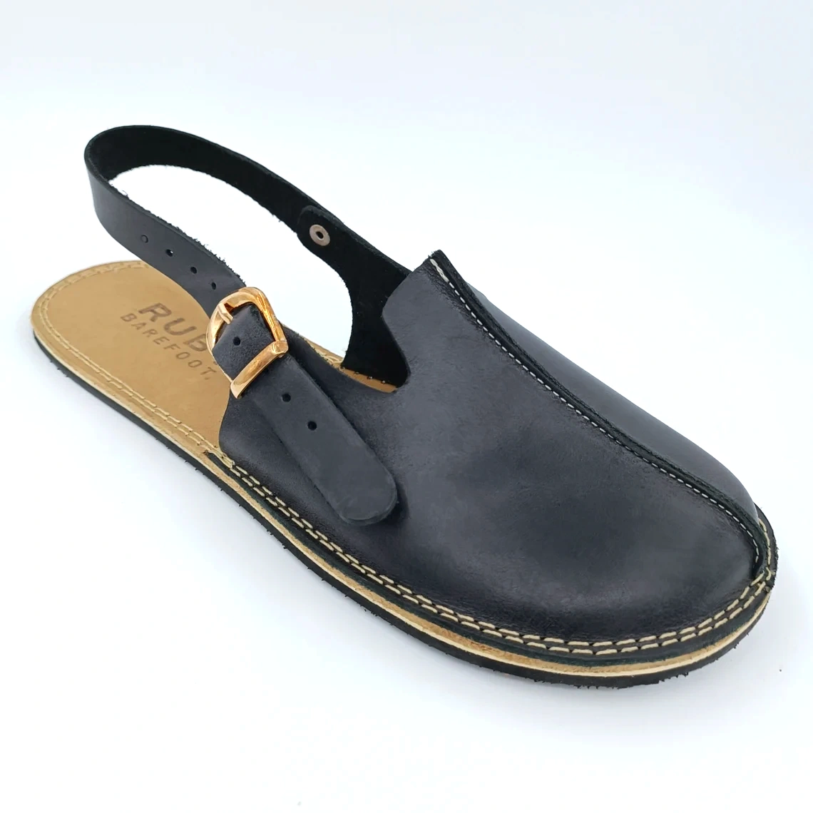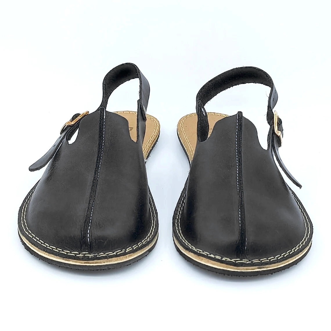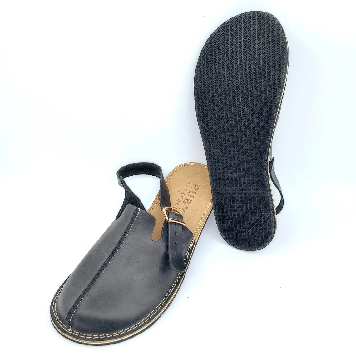 Minimalist closed-toe barefoot women’s sandals with a flexible black rubber sole. Designed for natural movement, comfort, and everyday wear.