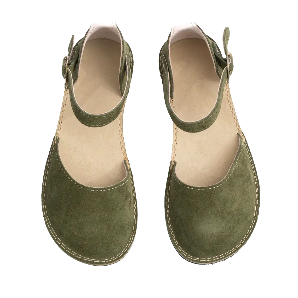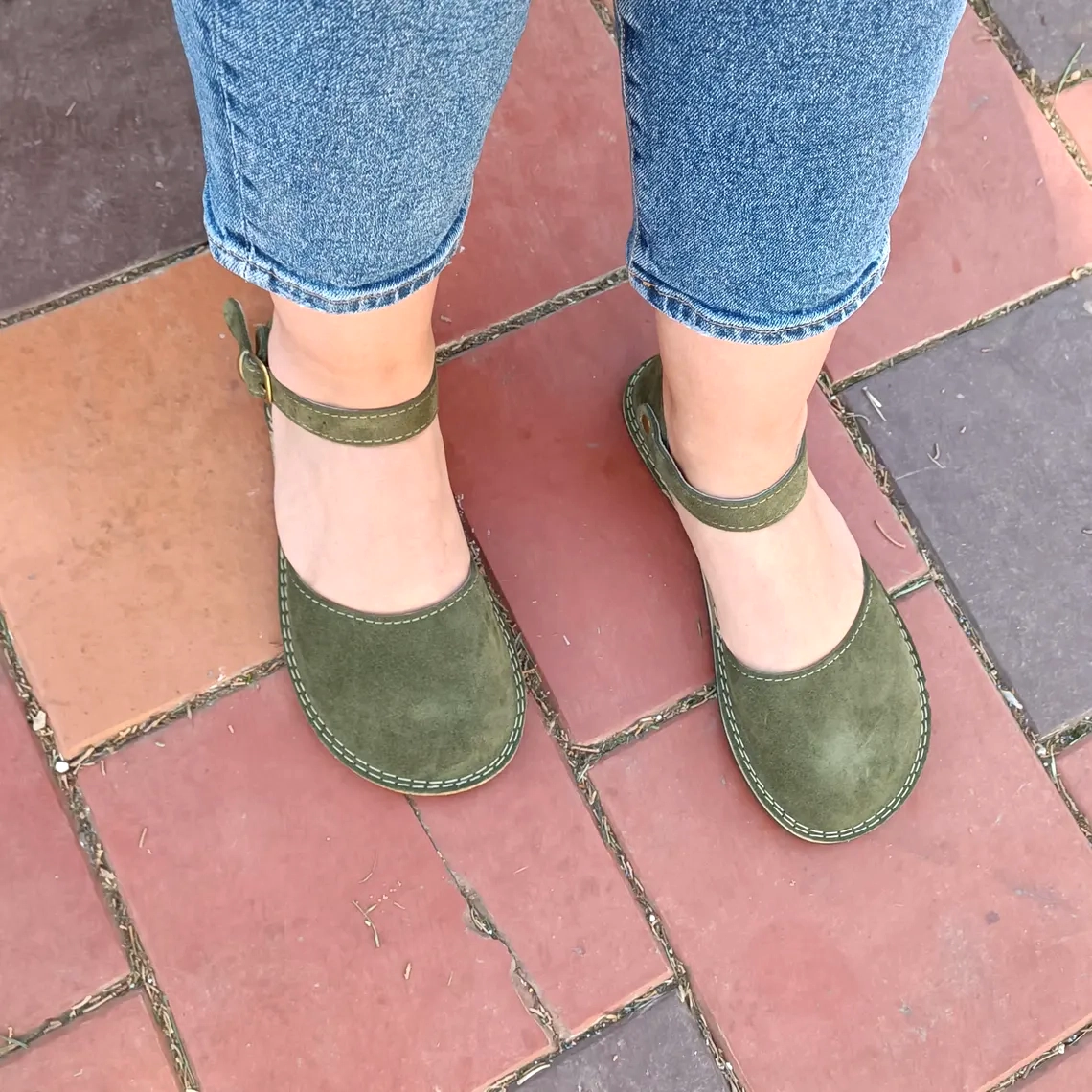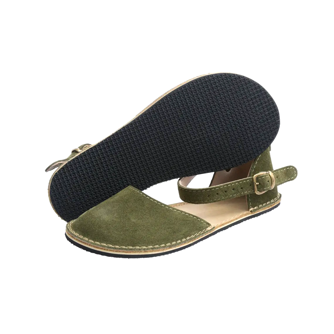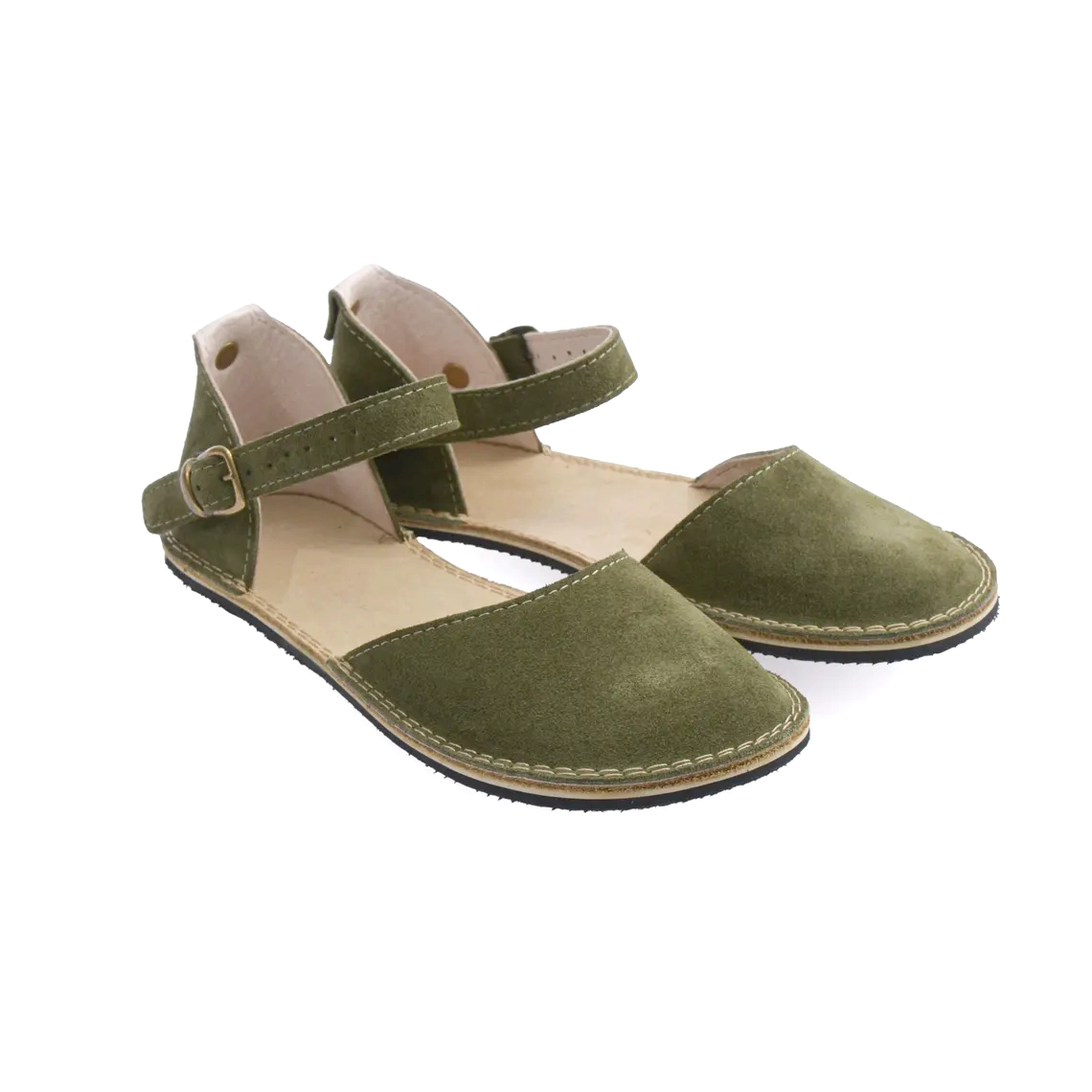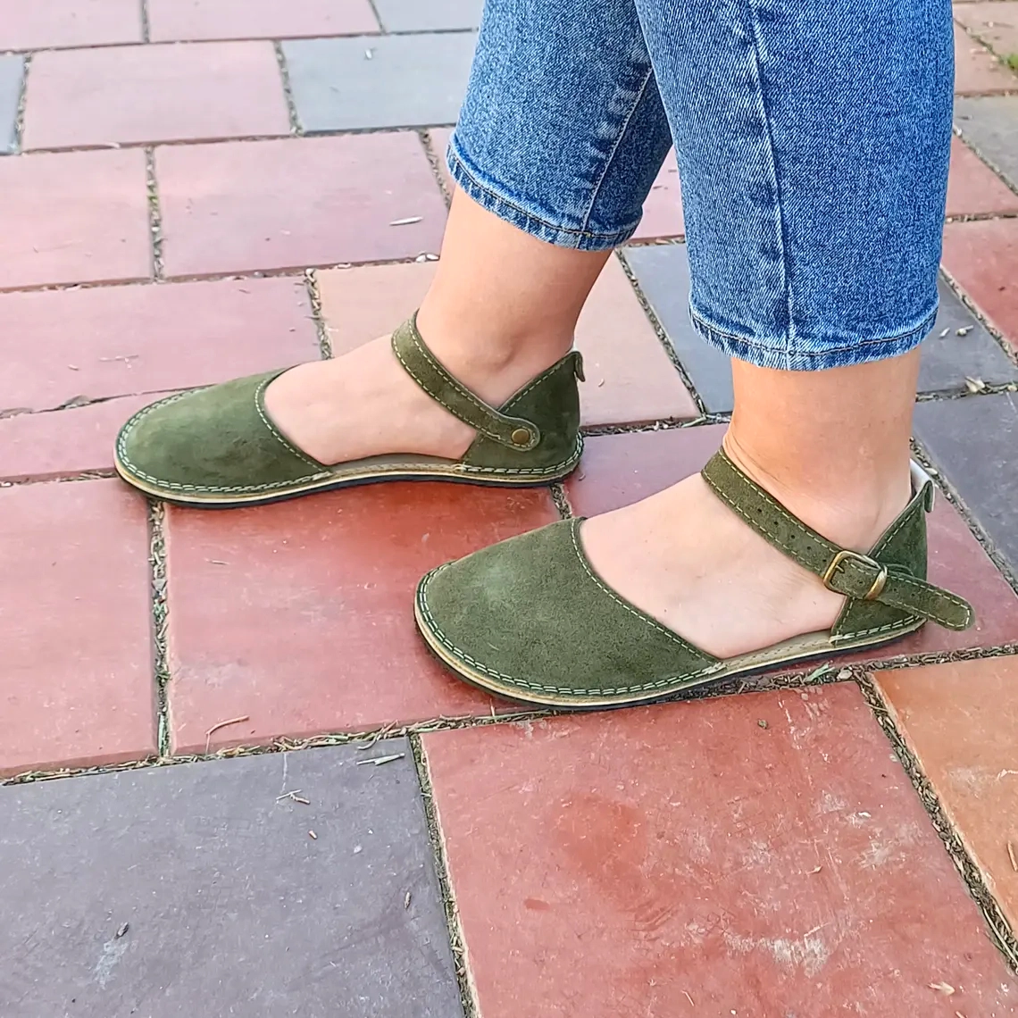 Barefoot Green Suede Minimalist Women Sandals – Natural Leather, Wide Toe Box, Zero Drop