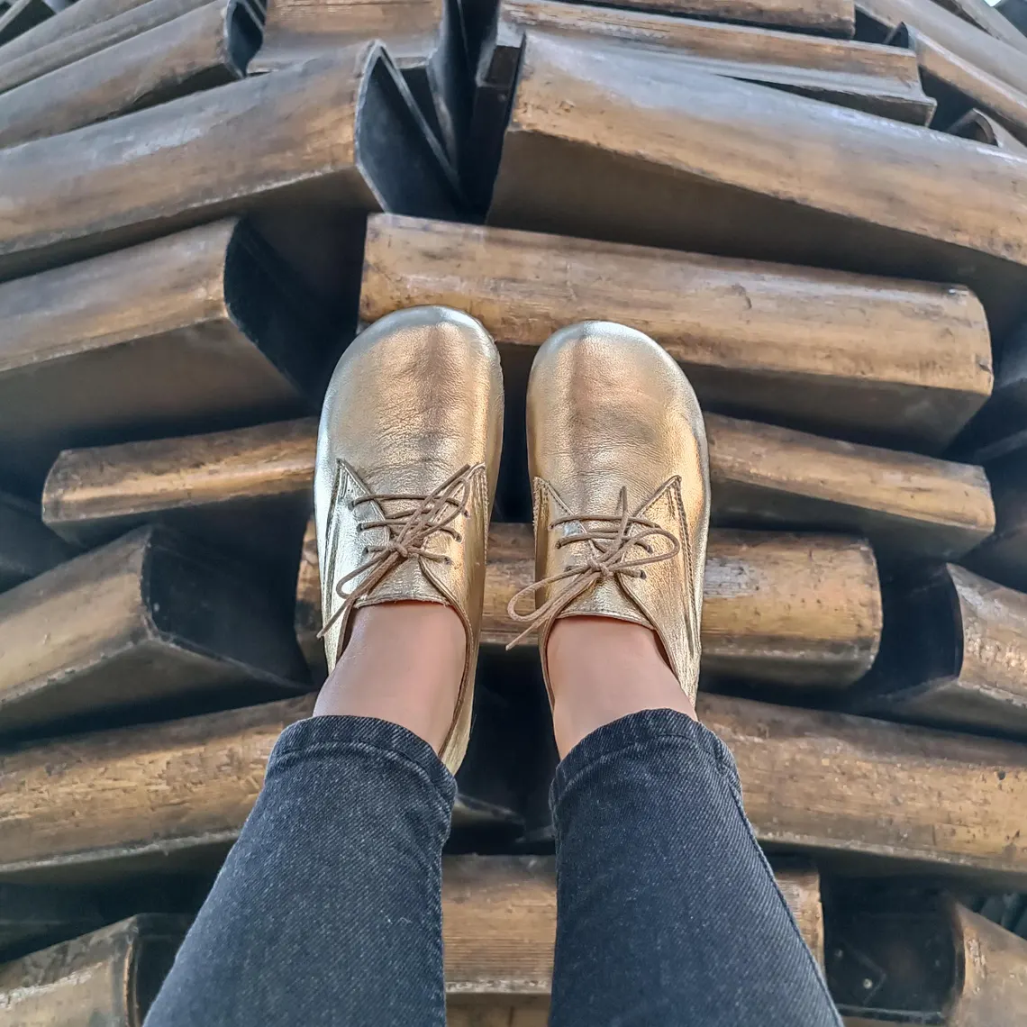Leather Sole Copper Rivet Barefoot Oxford Lace-Up Women Shoe Golden (Grounding Shoe)