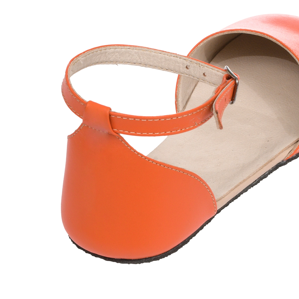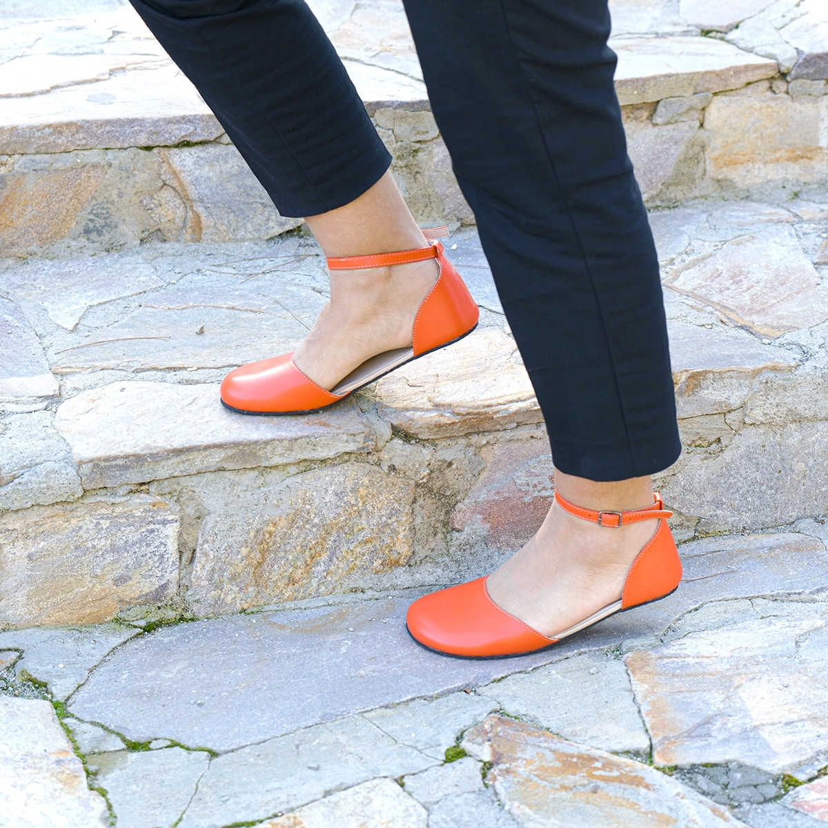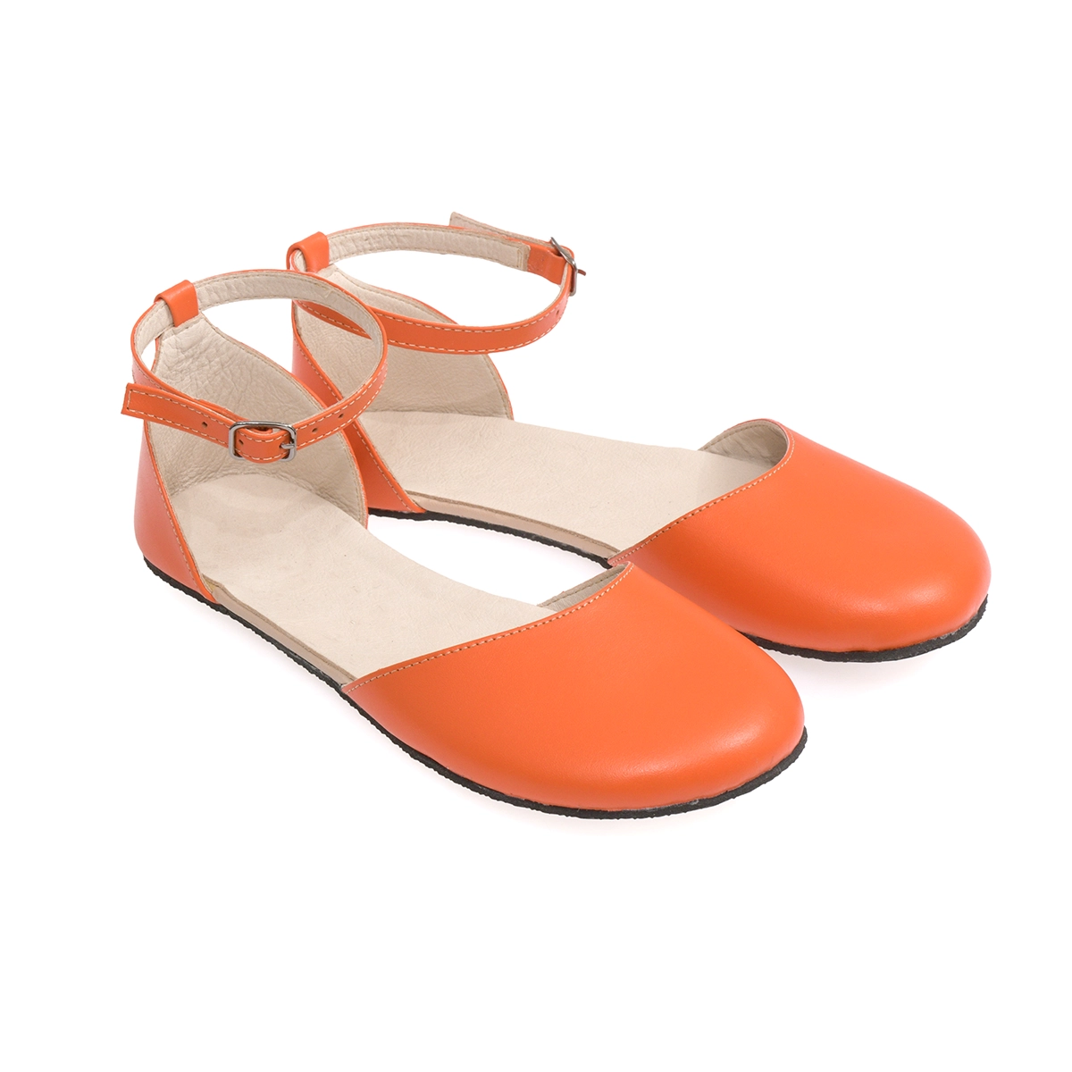 Handmade women’s orange leather barefoot Mary Jane sandals with a flexible sole and minimalist design. Natural comfort, bold style, and everyday elegance.