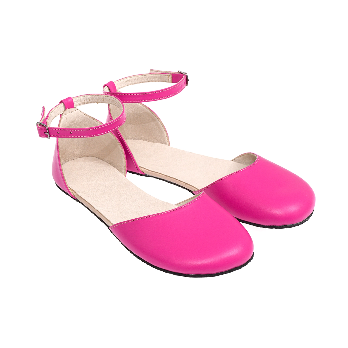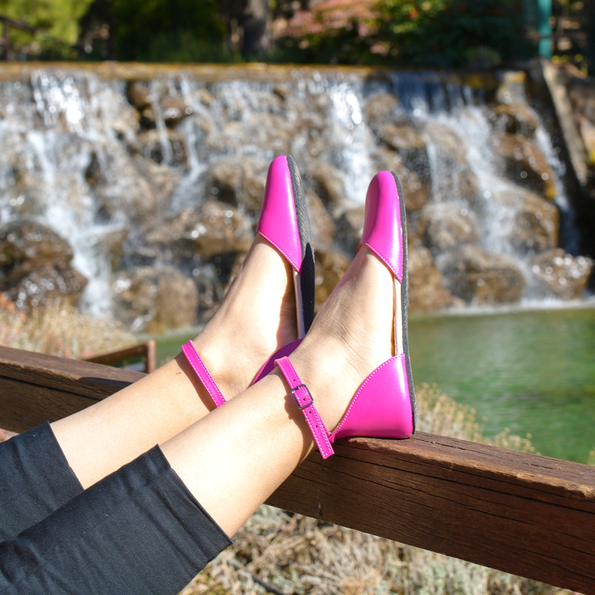 Handmade women’s barefoot Mary Jane sandals in pink. Minimalist design, flexible sole, and natural comfort for stylish everyday summer wear.