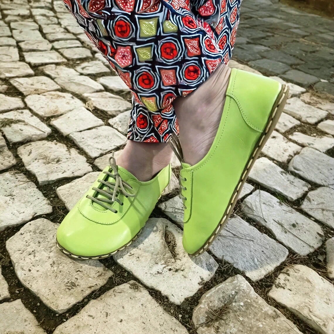 Pistachio Green Leather Handmade Barefoot Copper Grounding Sneakers for Women