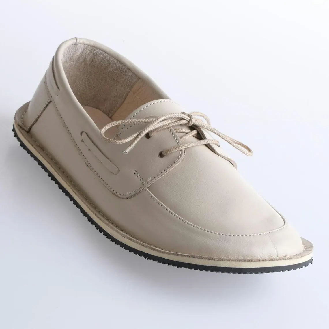 Beige color barefoot boat moccasins are made of genuine leather. It has a wide toe box for your toes to be comfortable. Thanks to the zero drop rubber sole, it provides the right posture for your body.
