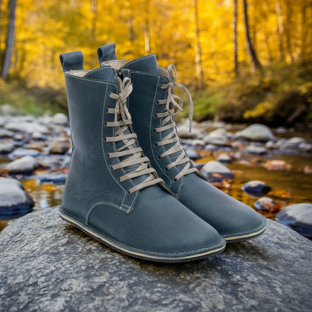 Elevate your winter style with our blue color Womens Barefoot Boots, expertly designed for both comfort and functionality. These handmade leather boots feature a sleek lace-up design with a convenient zipper for easy on-and-off access.