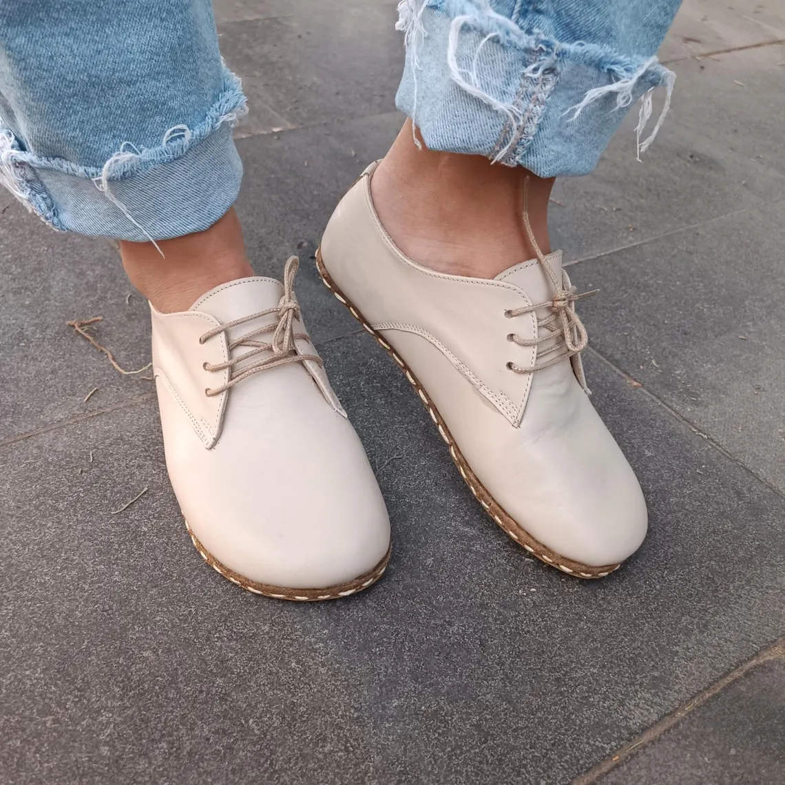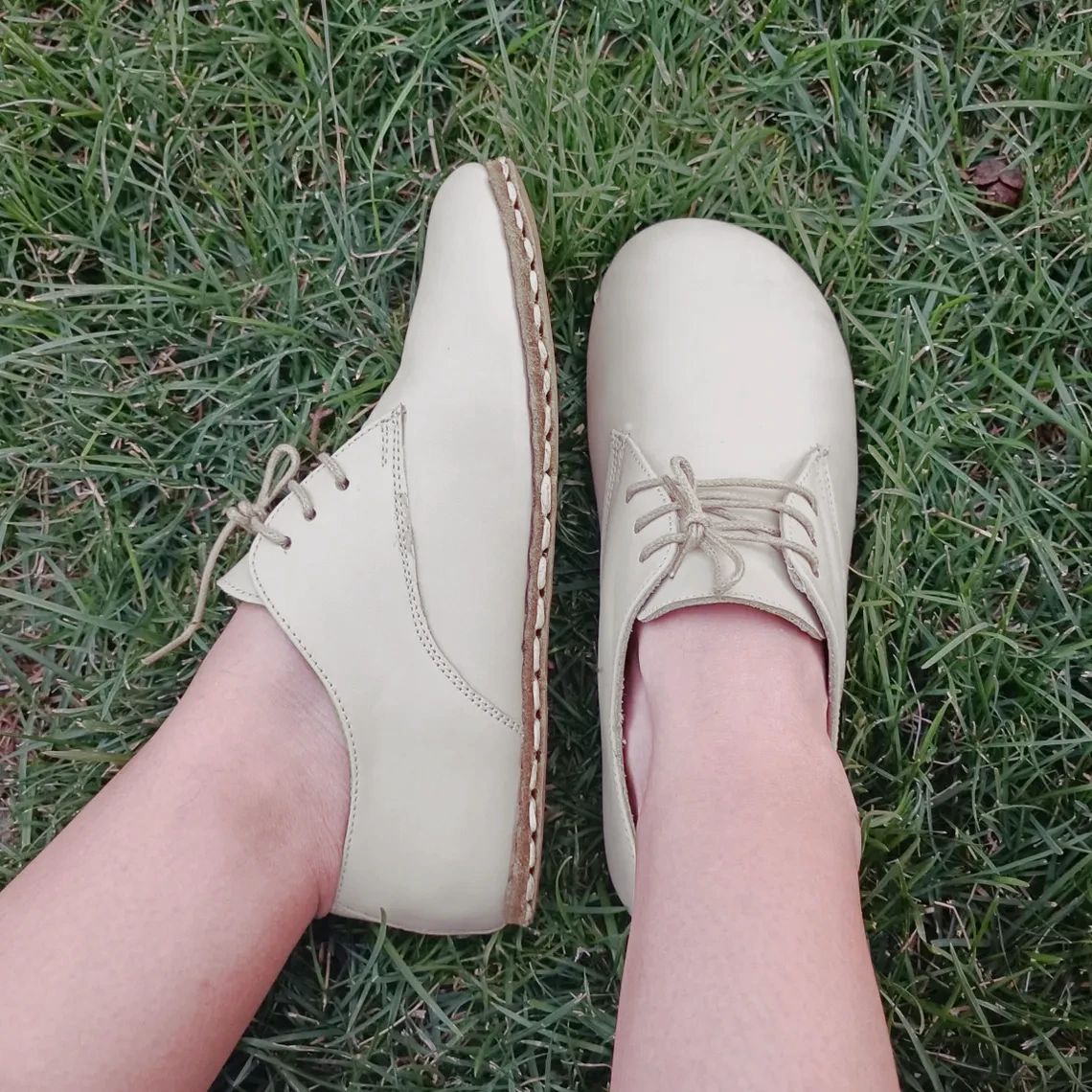 Leather Sole Copper Rivet Barefoot Oxford Lace-Up Women Shoe Beige (Grounding Shoe)