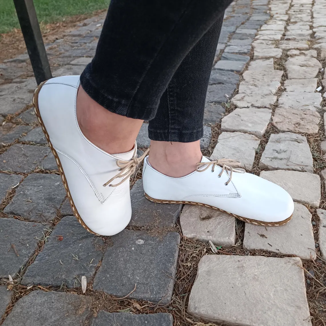 Handmade white barefoot oxford shoes for women with copper rivet grounding technology, zero-drop sole, and natural minimalist comfort. Women’s handmade white barefoot oxford shoes featuring copper rivet grounding, wide toe box, and zero-drop sole for natural movement and everyday comfort.
