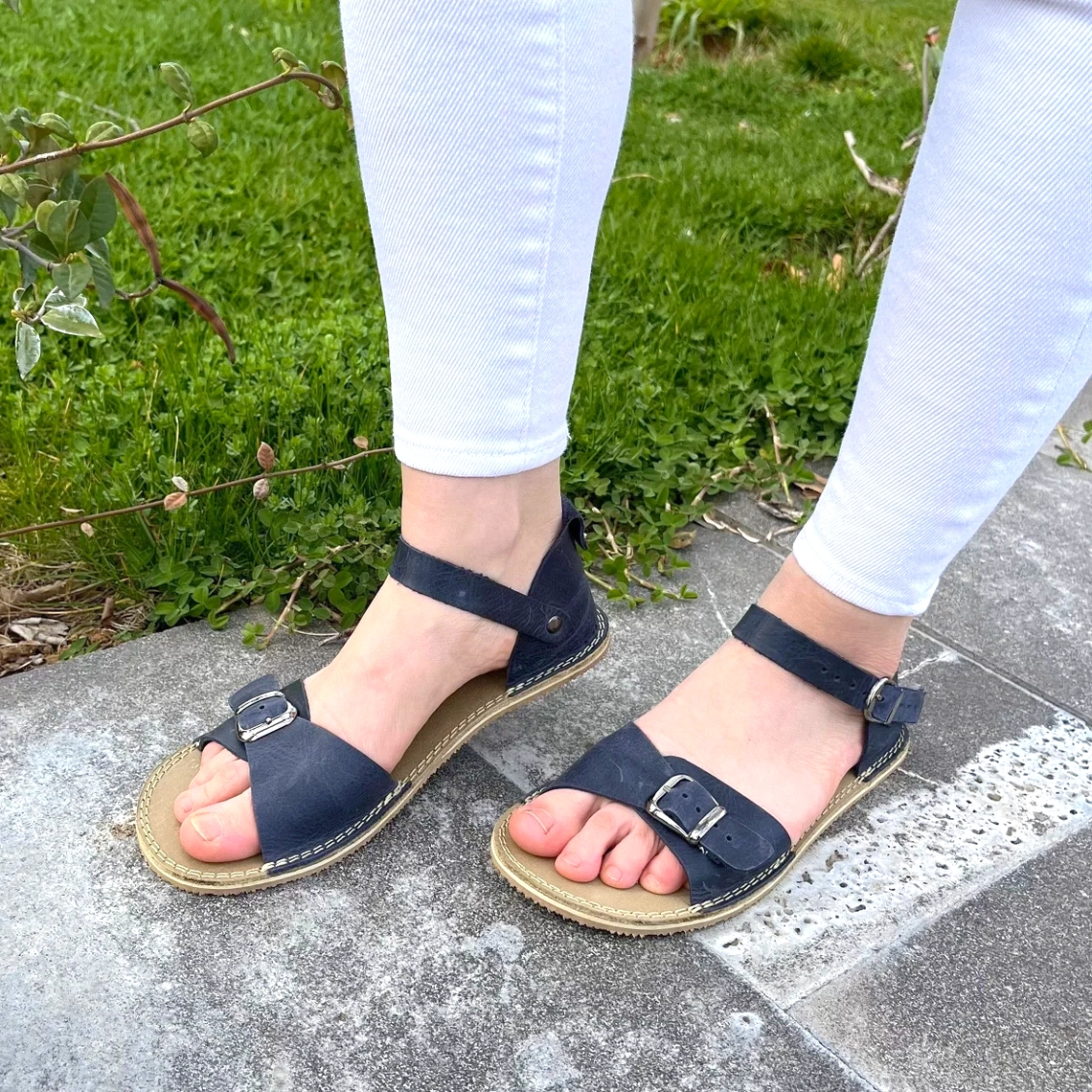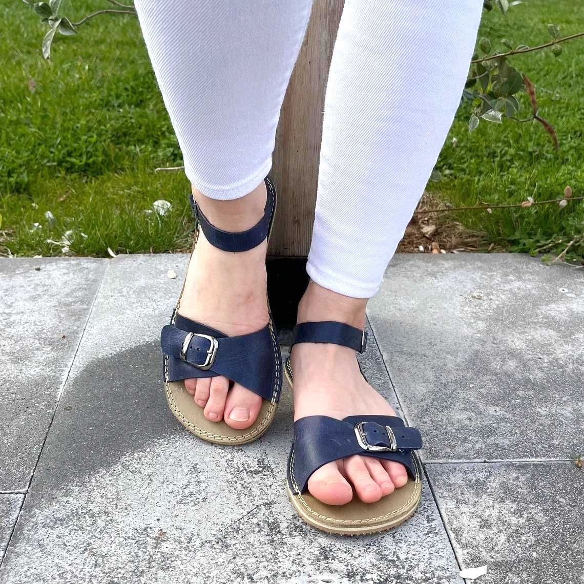 Navy blue minimalist barefoot handmade soft leather open toe and closed heel woman sandals are 100% handmade from all sustainable natural materials. Ruby women casual sandals not only have a rich story but also have a unique aesthetic quality, and comfort.