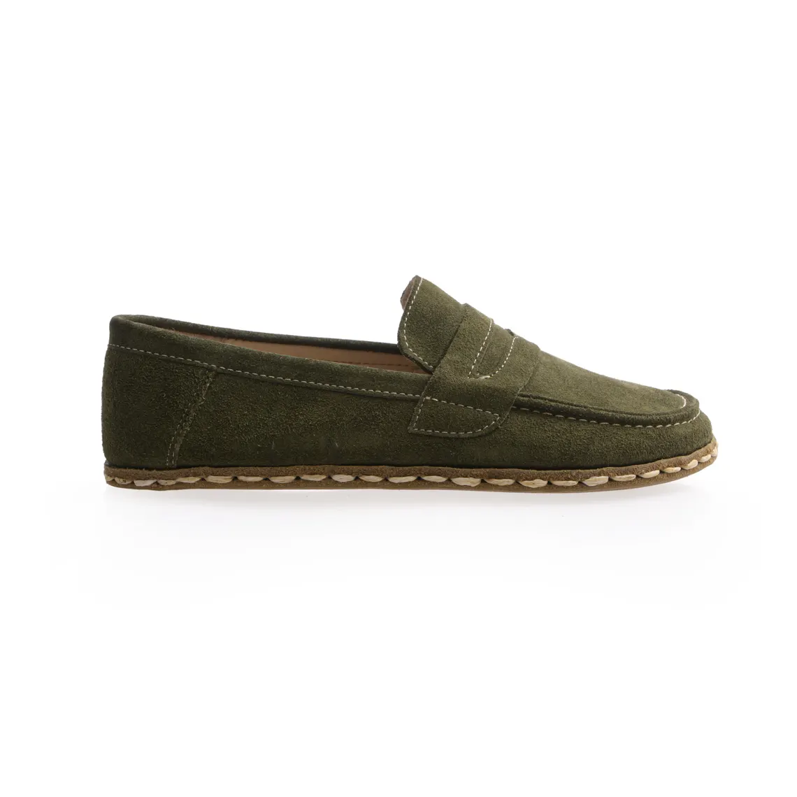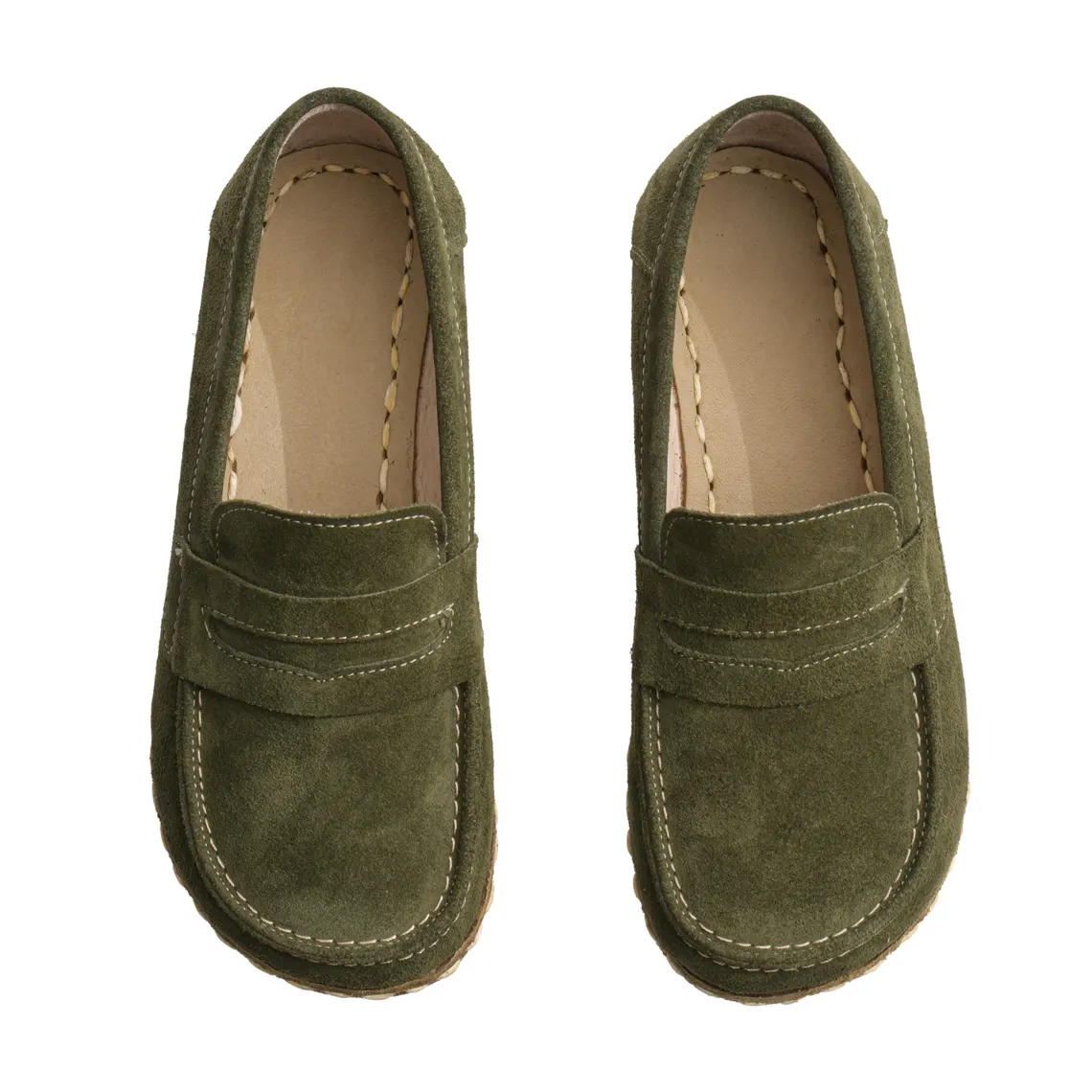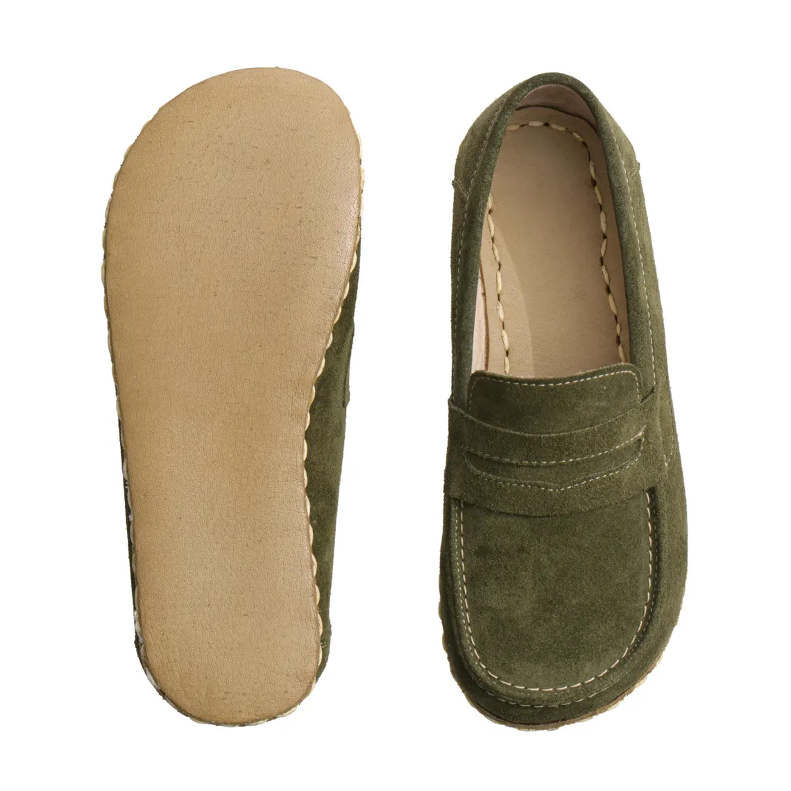 Women’s Green Suede Barefoot Grounding Penny Loafers – minimalist barefoot shoes with grounding technology, wide toe box, zero-drop sole, and flexible suede design for natural walking comfort.